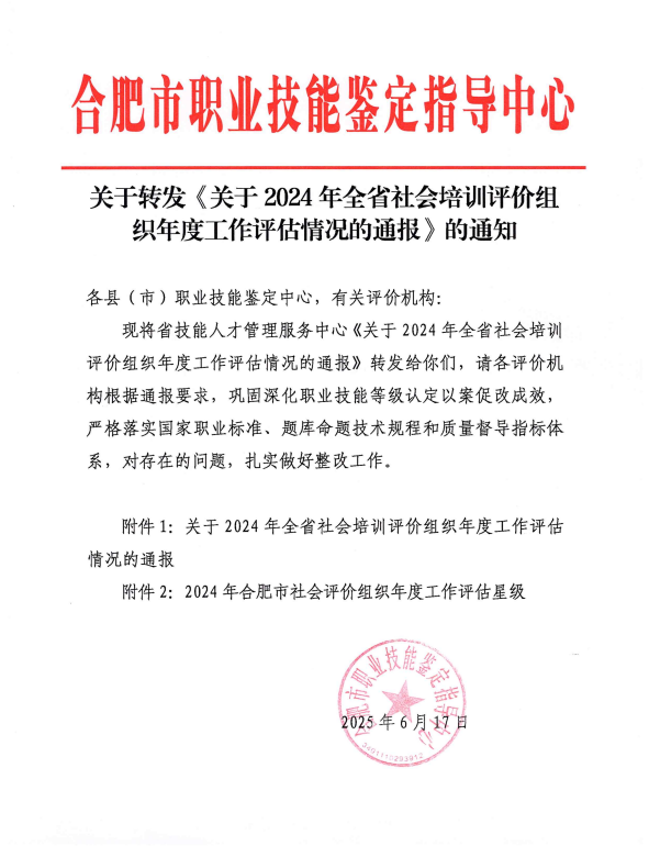 克日,合肥市职业手艺判断指导中心宣布关于转发《关于2024年度全省社会评价组织年度事情评估情形的转达》(皖技管服函〔2025〕2号),我机构依附卓越的事情效果和规范的治理系统,荣获“2024年度五星级社会评价组织”称呼。标记着职业手艺品级认定事情迈入全新阶段。